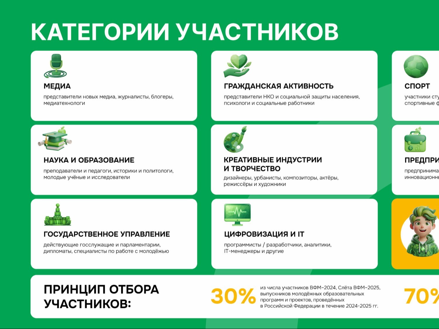 Участниками Фестиваля станут 10 000 молодых лидеров из 190 стран мира. К участию приглашается молодежь в возрасте от 14 до 35 лет из России и из-за рубежа.