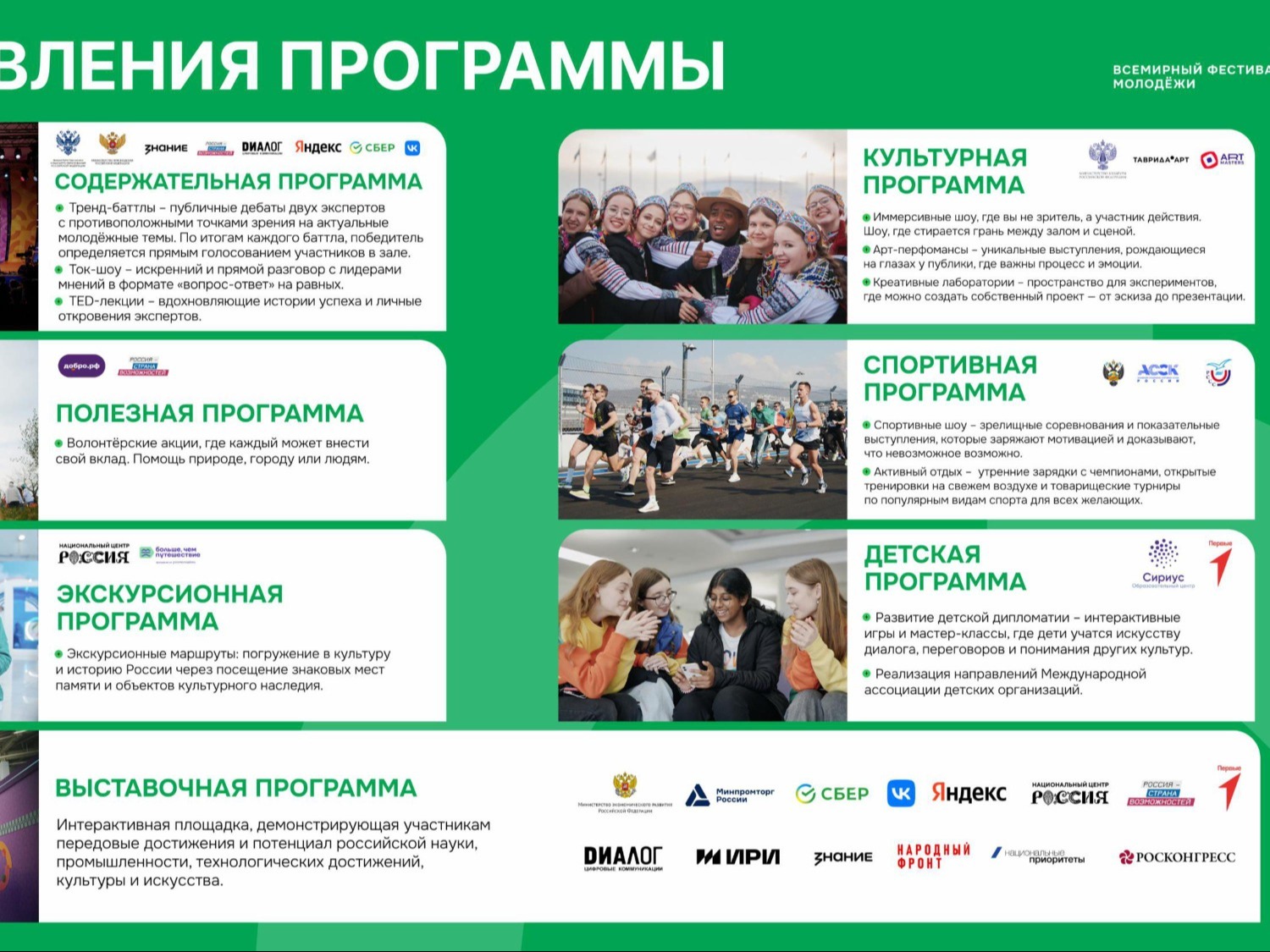 Фестиваль пройдет под девизом «Следуй за мечтой. Вместе с Россией» и станет не только пространством для открытого международного диалога и объединения народов, но и витриной лучших российских проектов и практик. Участников мероприятия ждет насыщенная программа, направленная на обмен опытом, обсуждение актуальных вопросов в области молодежной политики, международного взаимодействия, науки, технологий и образования. Вместе они будут формировать образ будущего – многополярного мира, основанного на сотрудничестве и поиске баланса интересов.